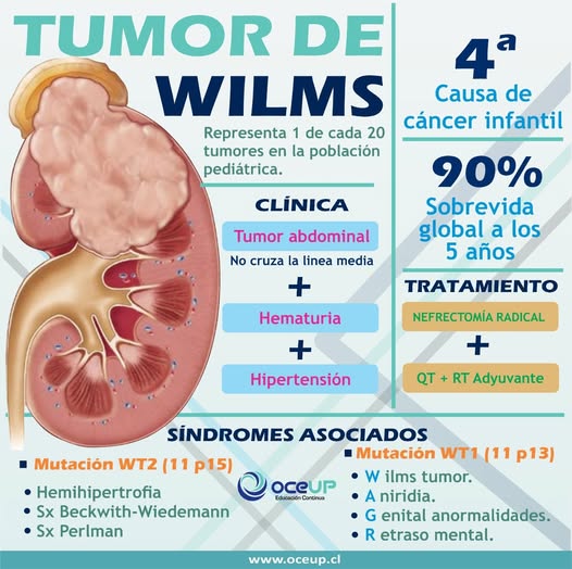 El tumor de Wilms, también conocido como nefroblastoma, es un tipo de cáncer que se origina en los riñones de los niños. Es el tipo más común de cáncer renal en la infancia y generalmente se presenta en niños menores de cinco años. Este tumor puede aparecer en uno o en ambos riñones, aunque es más común que afecte solo a uno.
